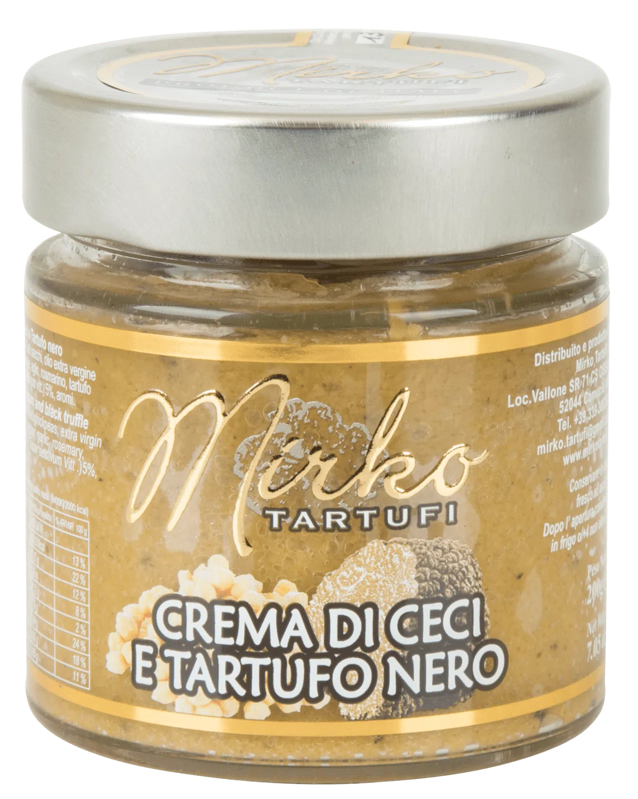 Dried Chickpeas, extra virgin olive oil, salt, pepper, garlic, resemary, black summer truffle (tuber aestivum vitt) 5%, aroma