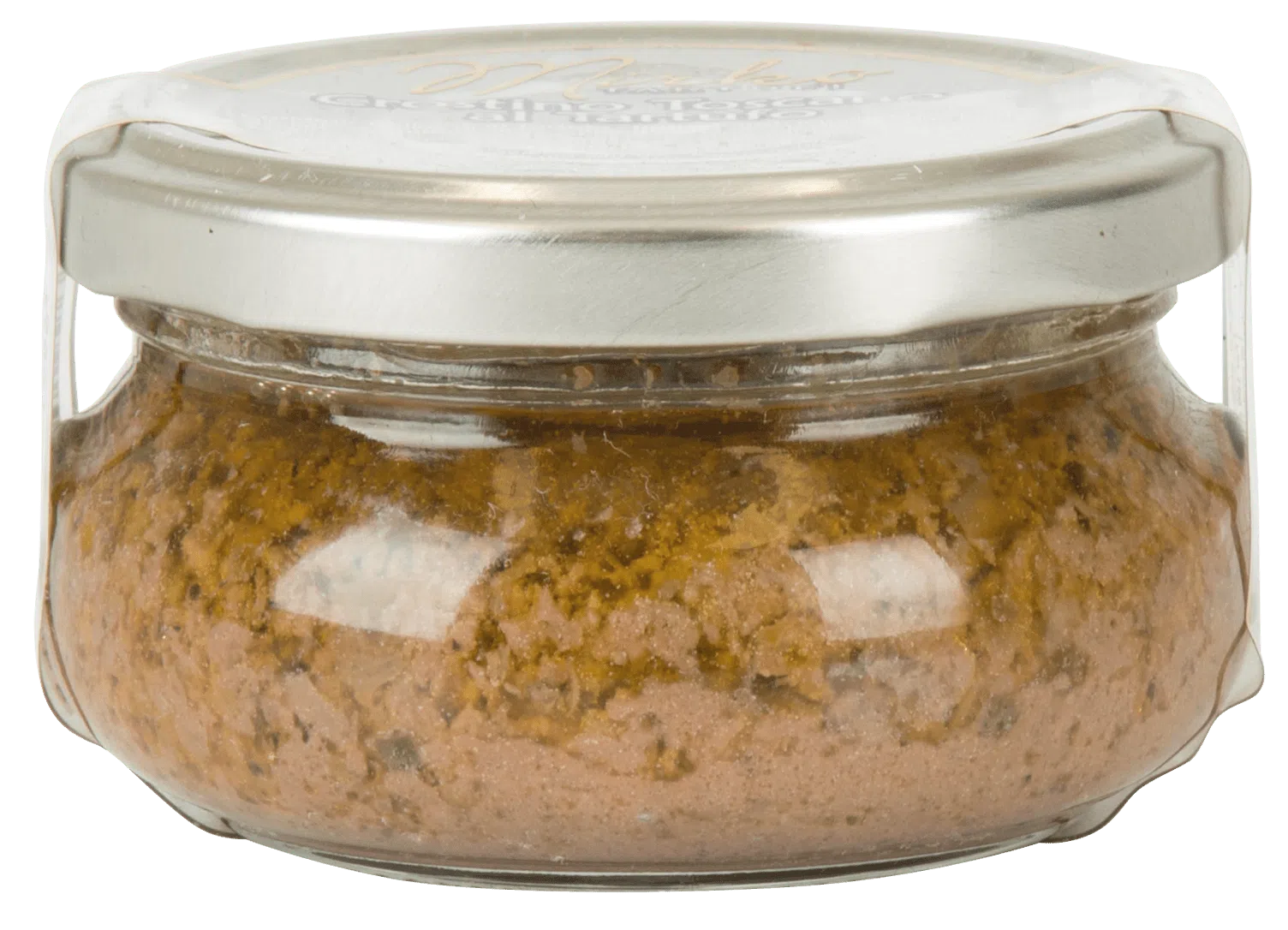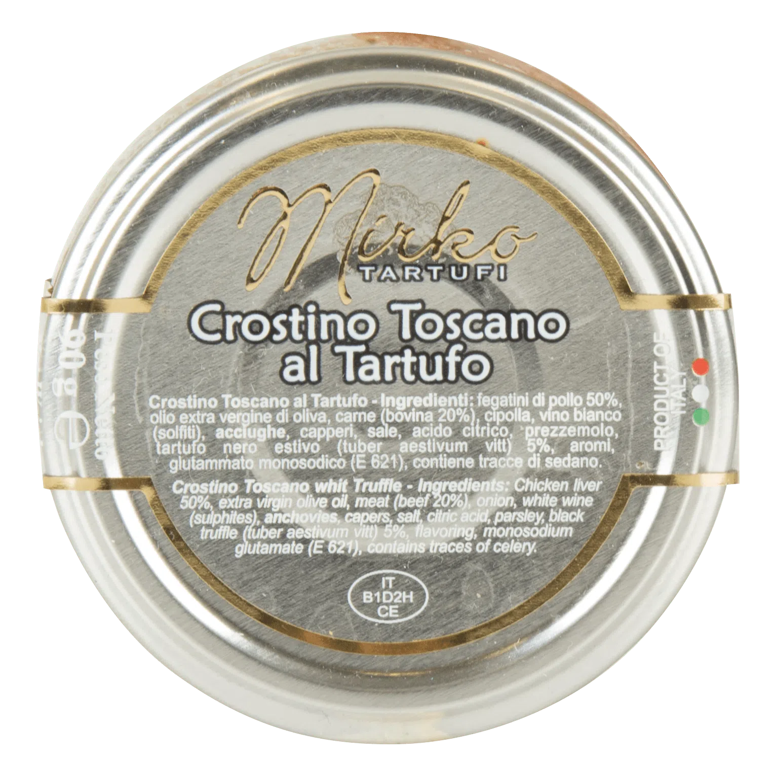 Chicken Liver 50%, Extra Virgin Olive Oil, meat (beef 20%), onion, whie wine (contain sulfites), anchovies, capers, salt, citric acid, parsley, Black Summer Truffle (Tuber Aestivum vitt) 5%, aroma, monosodium glutamate (E621). Contains traces of celery.